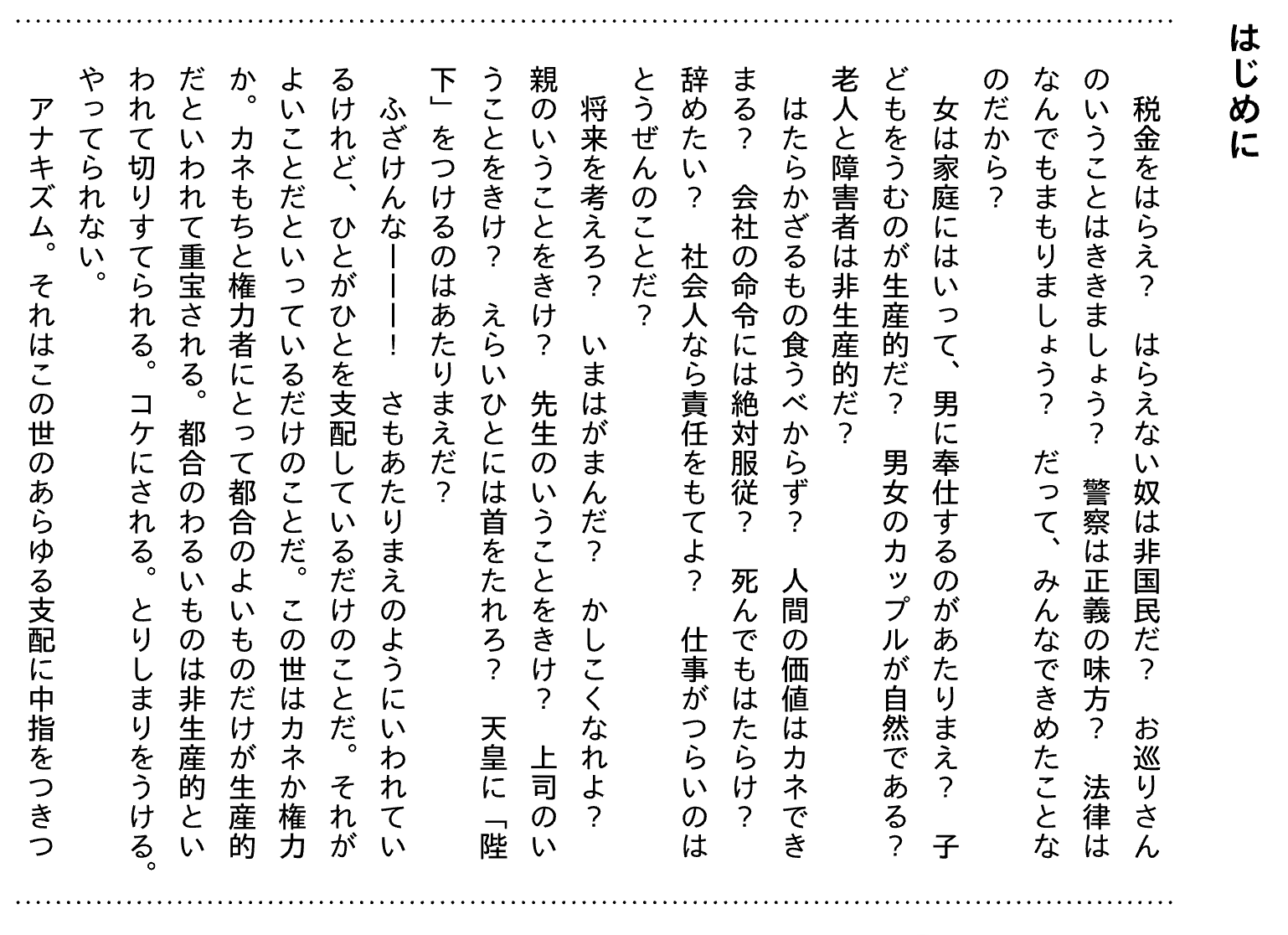 税金、政府、議会制民主主義、警察、監獄、労働、統治――